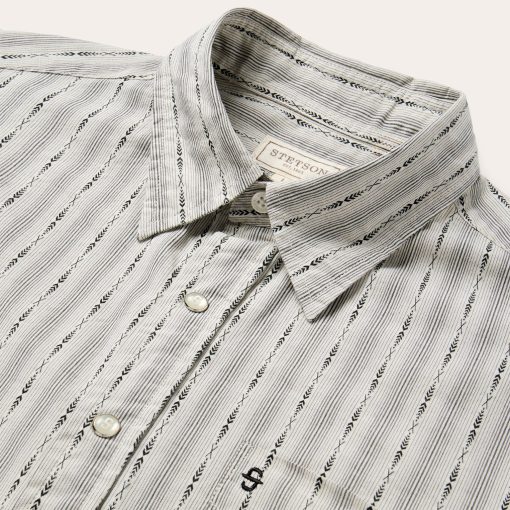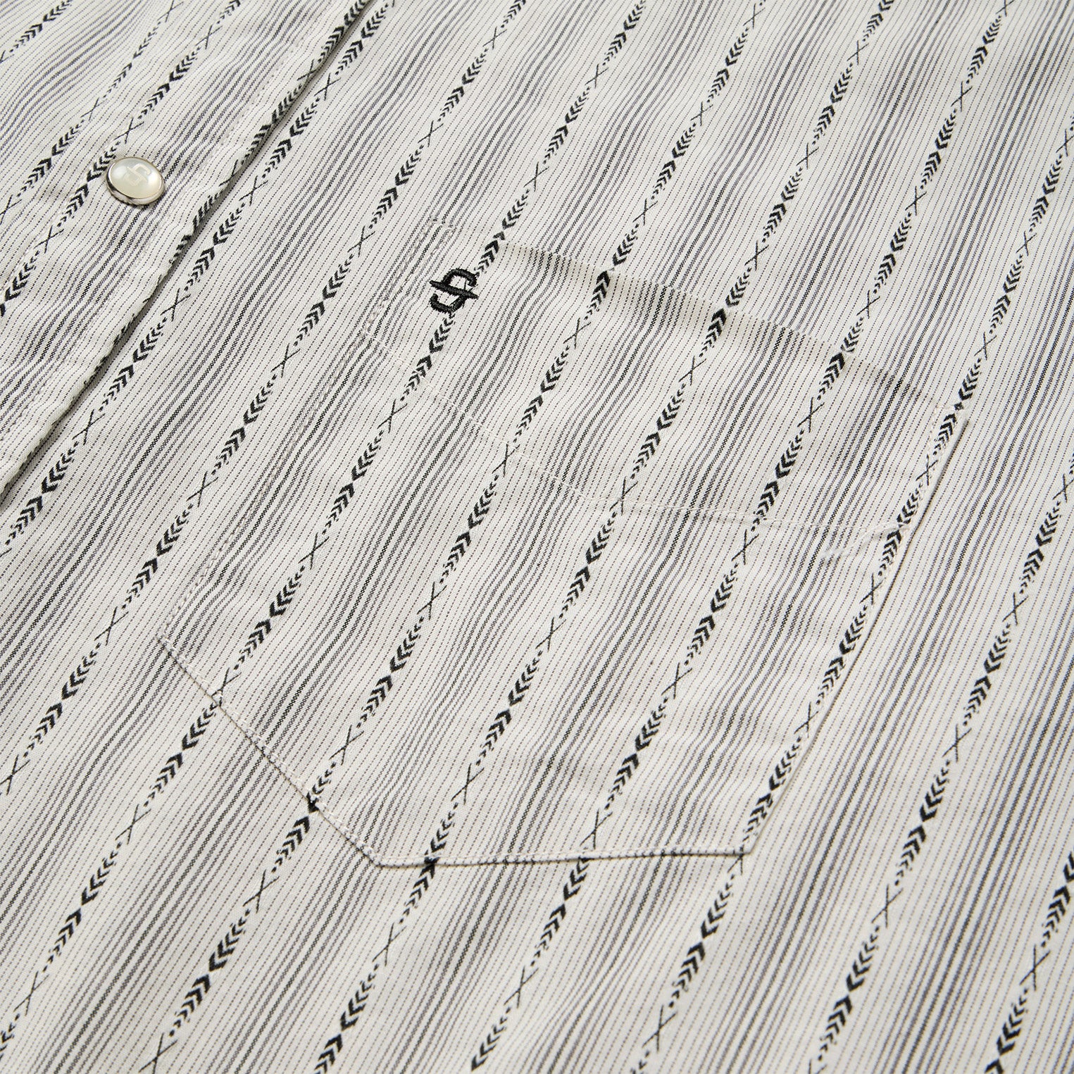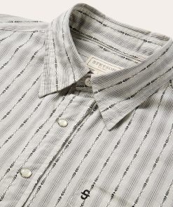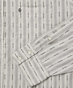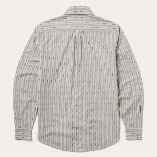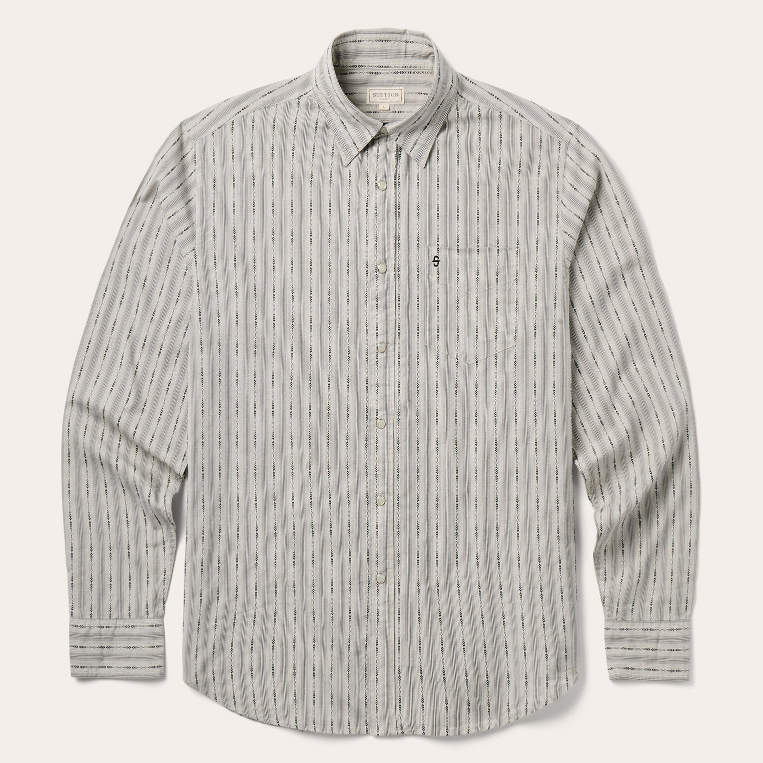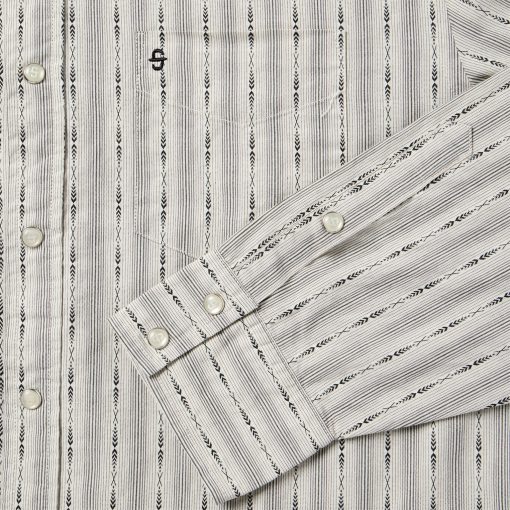 This western-inspired dobby stripe shirt is crafted from high-quality 100% cotton that’s been garment washed for a soft, broken-in feel that will only get better with time. It has a full snap front with pearl logo snaps, spread collar, no front yokes, a straight back yoke with center seam, pleat and a self-fabric locker loop. Cut in our Tailored Fit, a versatile style that’s slightly tapered at the sides for a streamlined appearance and a shorter length designed to look great tucked or untucked.