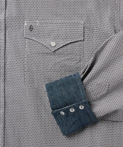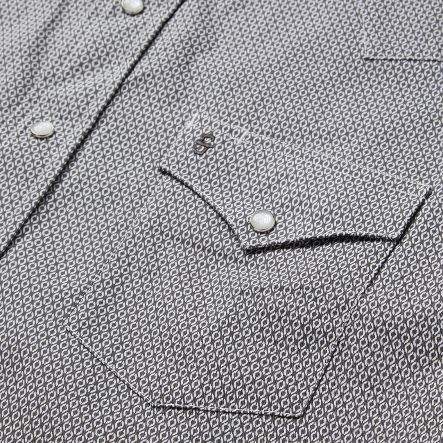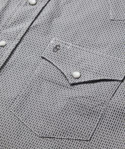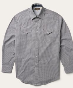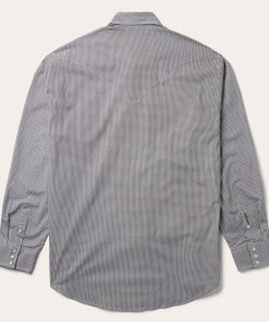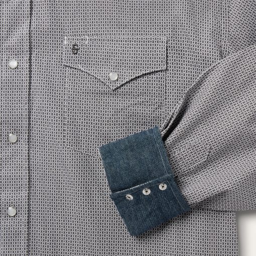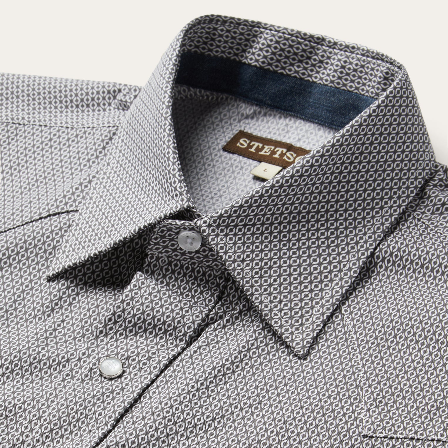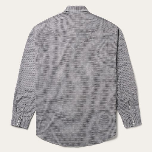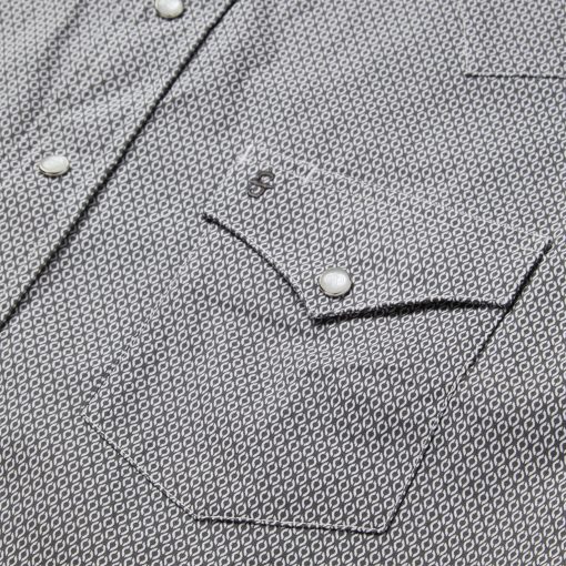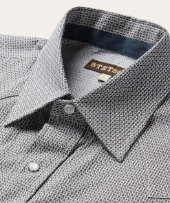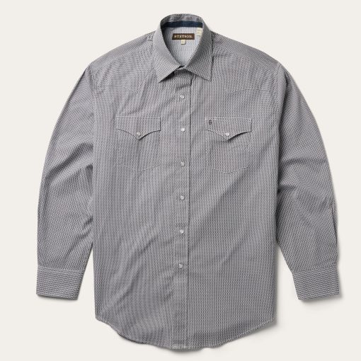 This Western shirt is crafted from a lightweight cotton poplin with a Grey Geo allover print. It features a one-point curved back yoke, logo pearl snap front, and three snap cuffs. The signature Stetson “S” logo is featured on the front left pocket and “STETSON” is embossed on the right sleeve placket. It has a denim strip on the inside collar band and is garment washed for a soft feel that only gets better with age. Cut trim for a modern fit and crafted with 100% cotton for quality and breathability.
