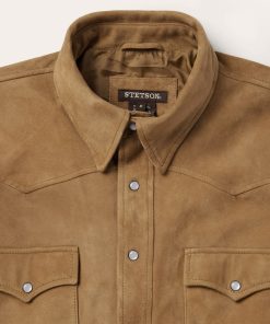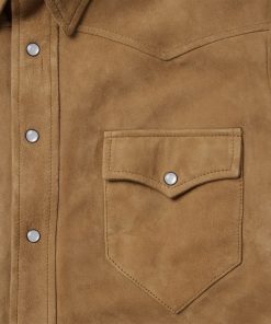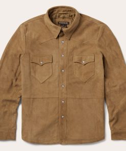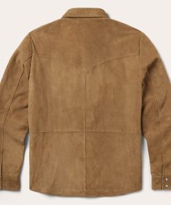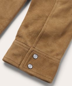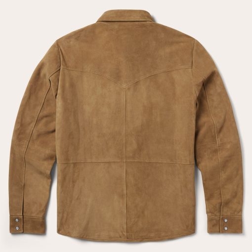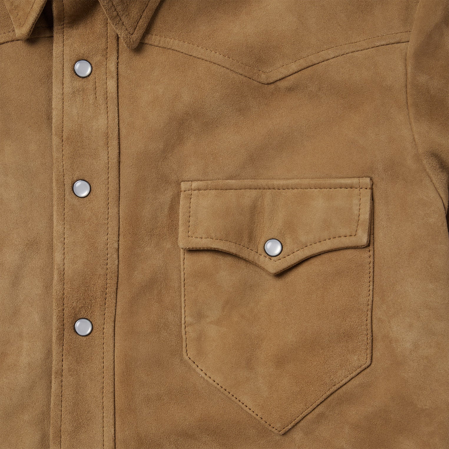 This rugged, western-inspired shirt jacket is crafted from high-quality suede leather and features single-point front and back yokes, single point front patch pockets with curved flaps, a classic snap front and two-snap cuffs.