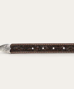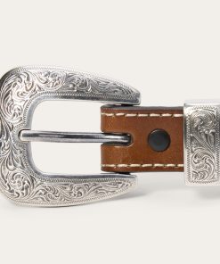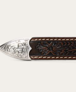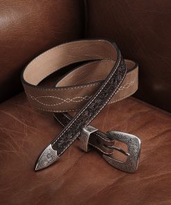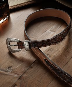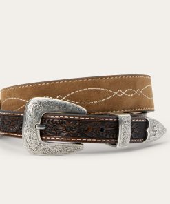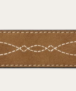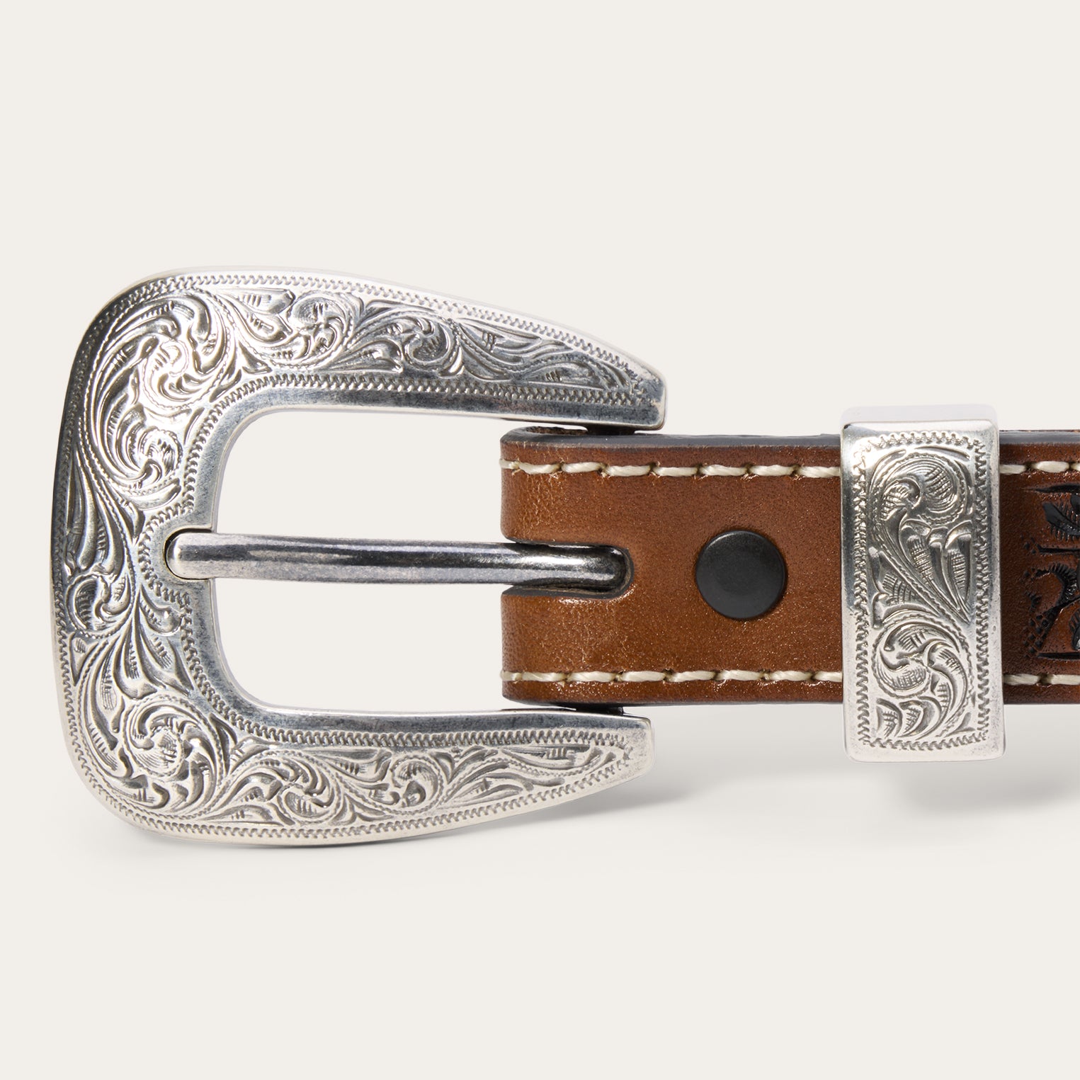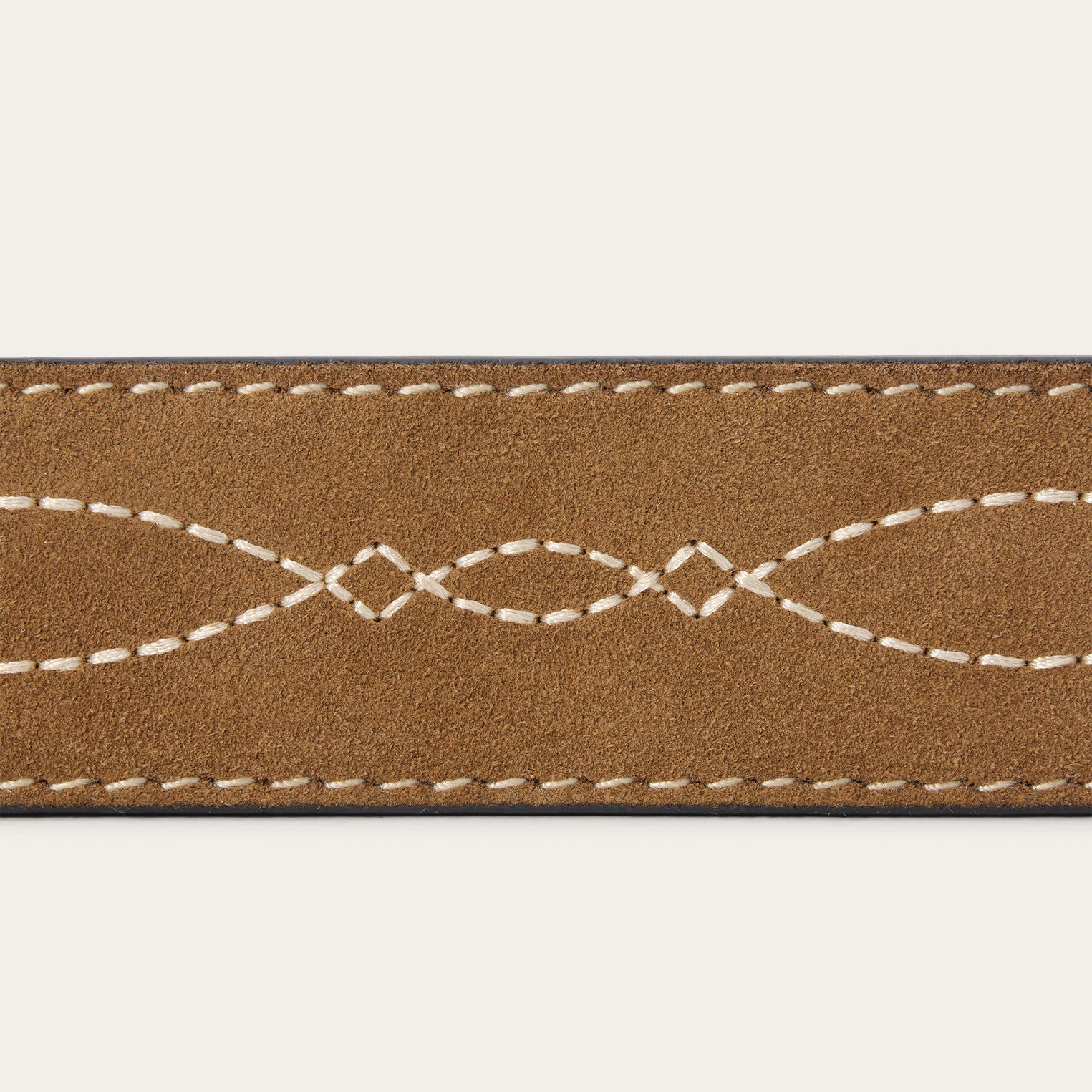 This belt has a 1 ¼” wide sand rough-out leather strap with western stitch detail and tapered 1” tooled, top-grain brown leather tabs. It features five holes on the point end to ensure a proper fit for all body types and is finished with a three-piece silver-tone Stetson buckle set. At once rugged and refined, each of our belts embodies our legendary commitment to quality and attention to detail.