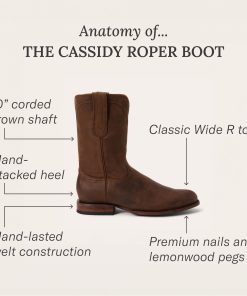 Designed for stability and comfort while wrangling calves, rugged roper-style boots have more support around the ankle than traditional western boots, along with a shorter heel. The Cassidy Roper Boot features a leather vamp and 10” corded shaft. It has a wide R toe—a classic all-purpose style that also dresses up well—and a 1 ⅜” walking heel. Its quality construction includes single welt soles, premium leather lining and a removable Tru-X insole that ensures comfort and support in every step.