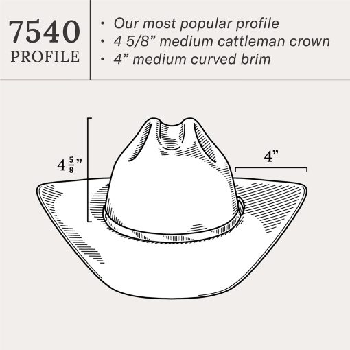 A true Stetson icon, our bestselling Skyline combines legendary quality and classic Western style in one timeless package. The Skyline is crafted from our proprietary 6X fur felt, which is prized for its durability and elegant feel, and, as with all hats that come out of our factory in Texas, each Skyline is touched by more than 100 sets of hands during production, resulting in a hat that is designed and built to stand the test of time. This edition features a 7540 profile, which translates to a 4 5/8” cattleman crown and 4” brim. Like all Skylines, it’s finished with a matching self-felt band and three-piece, silver-tone buckle. A handsewn genuine leather sweatband and full satin liner provide a time-tested fit and premium comfort.