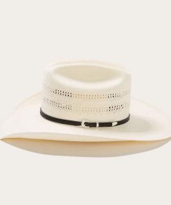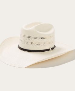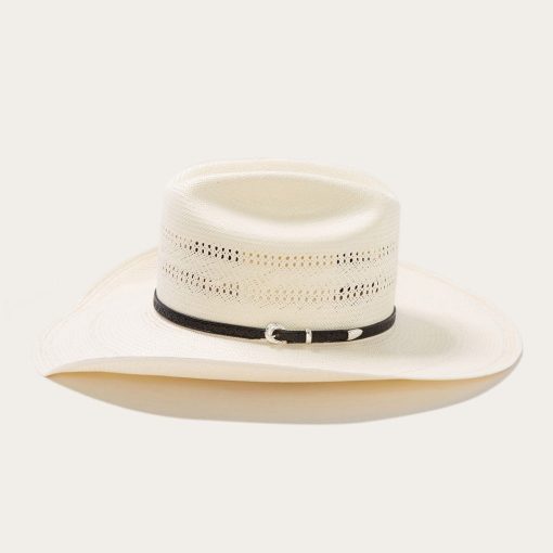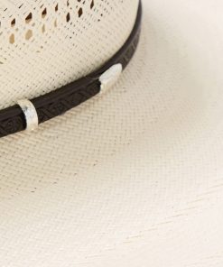 Handmade in the U.S.A. from high-quality shantung, the Southpoint 10X Straw Cowboy Hat has a 4 ½” brim and a regular oval 4 ⅛” cattleman crown which is vented for maximum circulation and breathability. Its rugged Western style is enhanced by a tooled leather hat band with three-piece silver-tone buckle set.