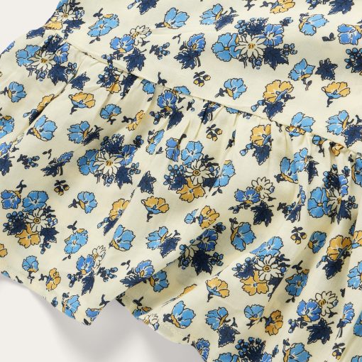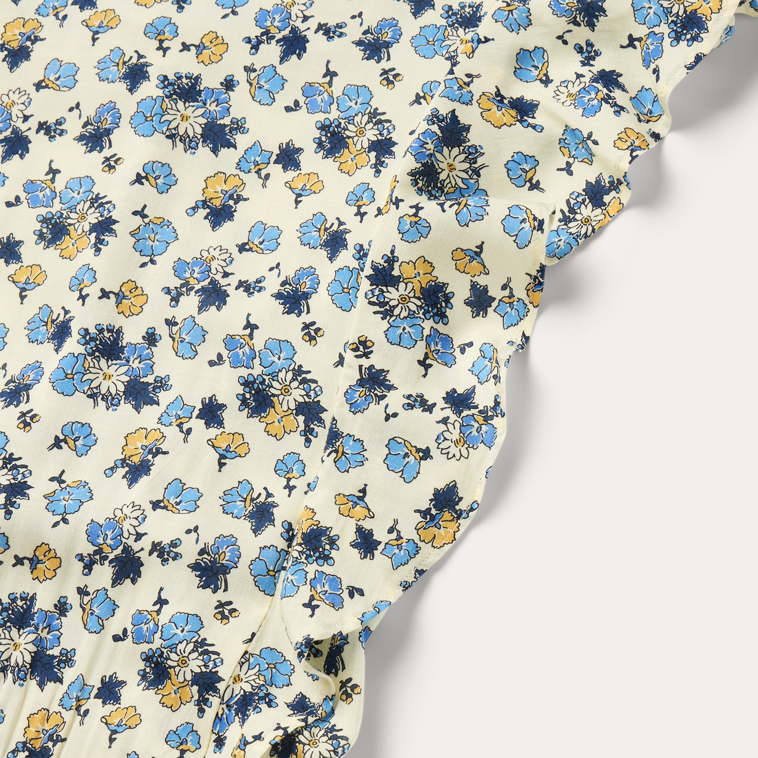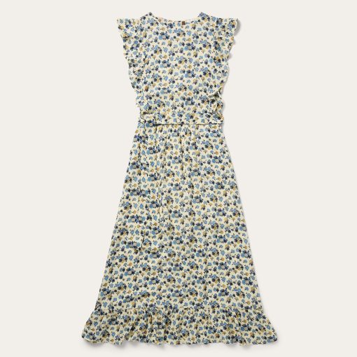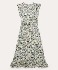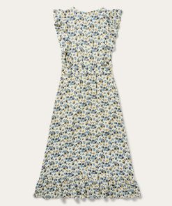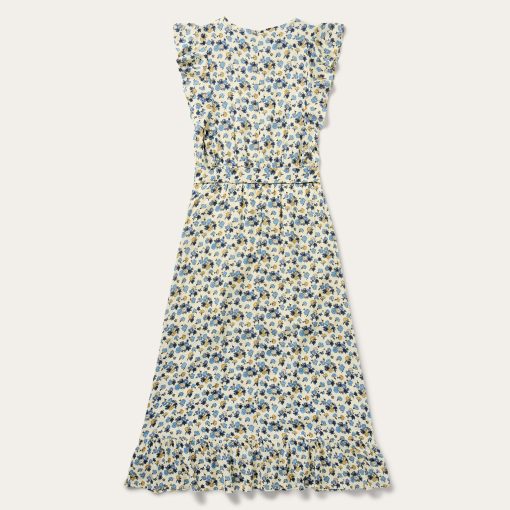 This stylish sleeveless peasant dress features our exclusive Field Flowers print. It’s crafted from high-quality 100% rayon, which has a smooth, silky feel and an easy drape. It features waterfall ruffles from shoulder to waist, fitted waistband with self tie belt, long skirt with ruffle hem, side seam pockets and zipper closure.