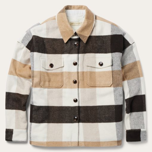 This stylish oversize plaid shirt jacket is crafted from a cozy wool blend, providing a layer of comfort whenever you need it. It has a full button front, dropped shoulders and single button cuffs, patch pockets with button closure flaps on the front and side seam pockets. Its body is sherpa lined for additional warmth. At Stetson, we use quality materials and fabrics to provide you with the best Western outerwear for women.