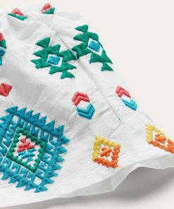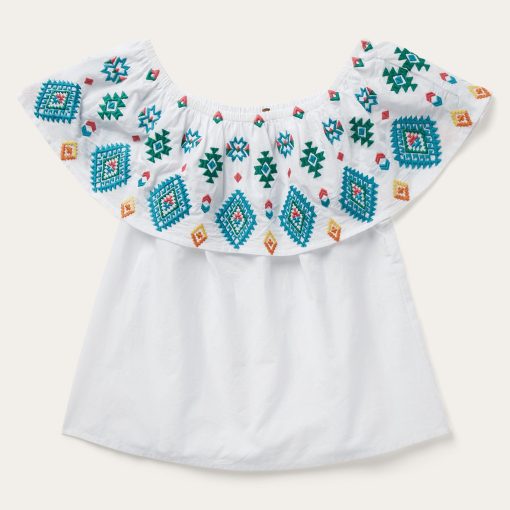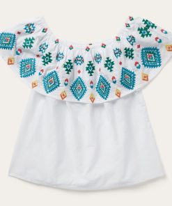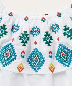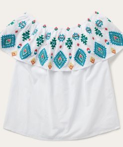 Colorful, lightweight and versatile, this white cotton lawn blouse is embroidered with our vibrant red, yellow and turquoise Bright Schiffli design. The stylish, off-shoulder design is finished with an elastic band at the top of the neckline for a secure and comfortable fit. Made with smooth 100% high-quality white cotton lawn fabric, this lightweight, Western-inspired top is ideal for any warm-weather gathering.
