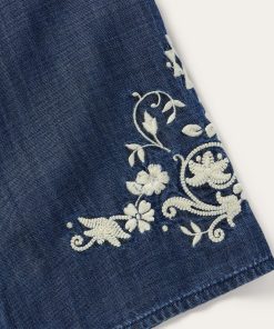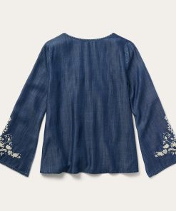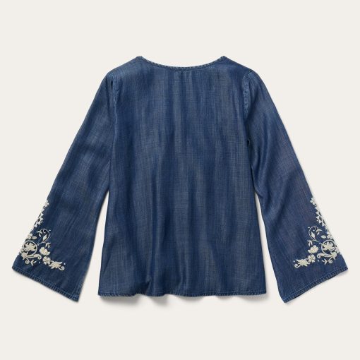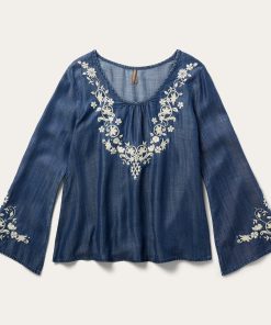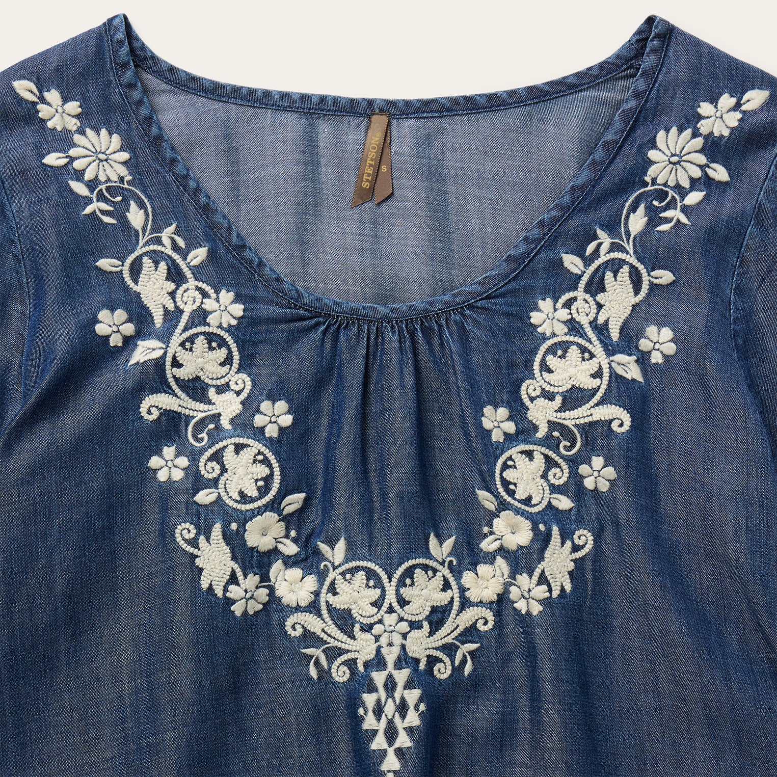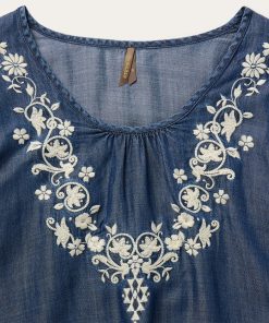 This pullover peasant blouse has a rounded v-neck and slight bell sleeves and features eye-catching floral embroidery. Crafted from 100% lyocell denim, it’s cut with an easy, flattering drape that allows for all-day comfort and freedom of movement.