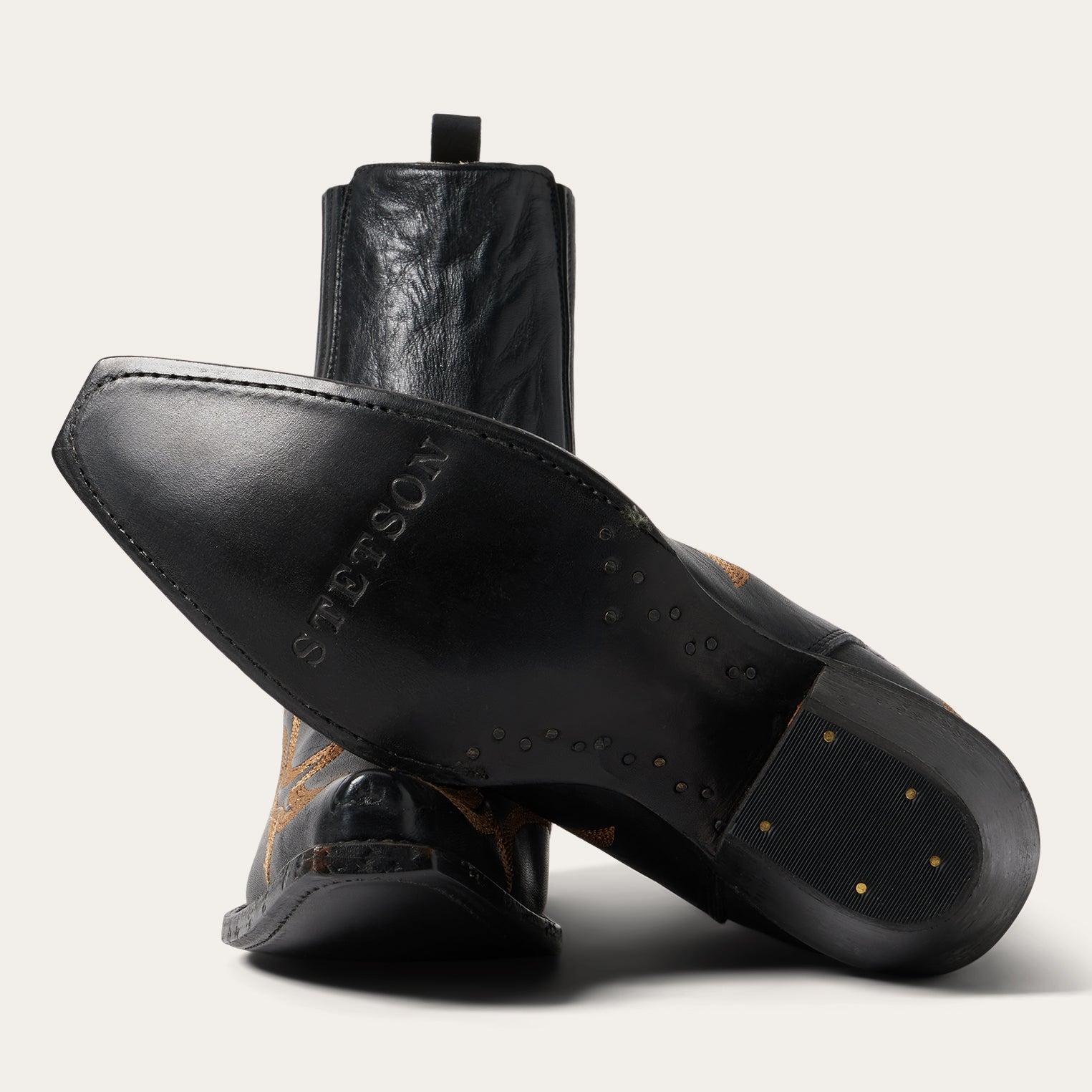 Our Western boots are handcrafted by Stetson’s legendary bootmakers from premium leather that’s designed to patina beautifully over time. Features include all leather lining, cushioned insole, premium brass nails and hand-driven lemonwood pegs that enable the boot to withstand the elements by expanding and contracting with any moisture the boot may encounter. Each pair is crafted by hand to ensure absolute comfort and performance. Frontier-tough, they conform to the wearer over time for years of reliable service. A classic addition to any wardrobe, these boots are a fitting companion for anyone with a strong appreciation for objects that are made well and get better with age.